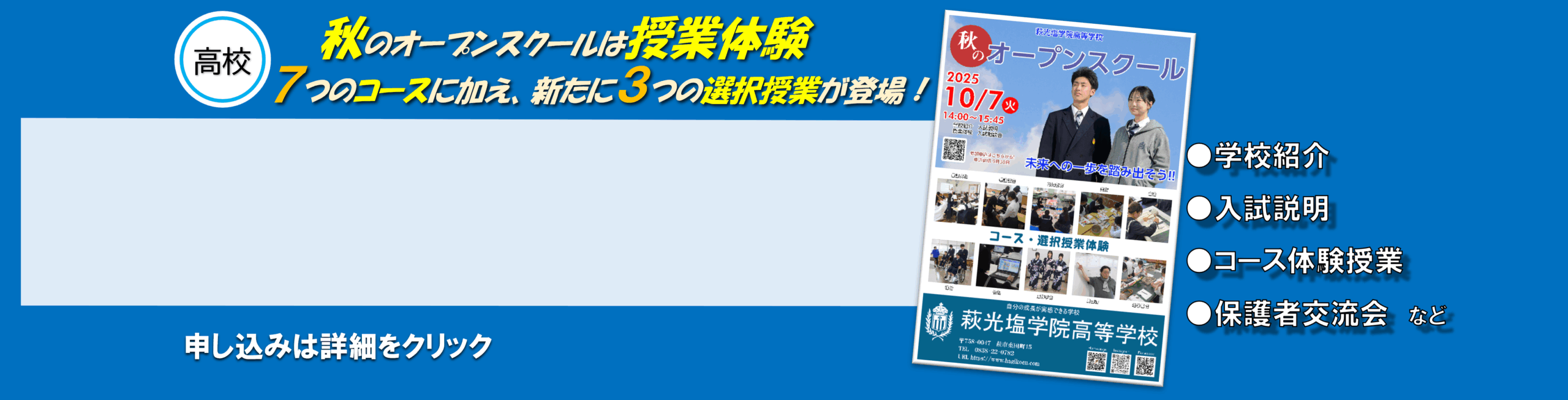 今年も体験授業を中心としたオープンスクールを予定しています。また、入試制度や授業料等の変更がありますので、そちらも説明させていただきます。 お申込みはHPから可能です。 ページの一番下のバナーより!ぜひ、ご参加ください!お待ちしています。 日時:10月7日(火) 14:00〜15:45 (受付13:45~)内容:学校紹介、授業体験(コース・選択授業)、入試・奨学金説明など [pdf-embedder url="https://hagikoen.com/wp/wp-content/uploads/2025/07/圧縮_夏OSポスター(完成版).pdf"] ↑お申込みはこちら!!…