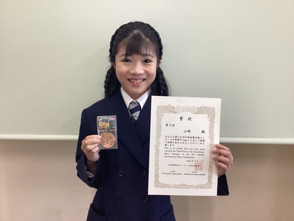 中1の山﨑さんが、第26回大阪国際音楽コンクール声楽部門Age-Jにおいて、3位に入賞しました!
