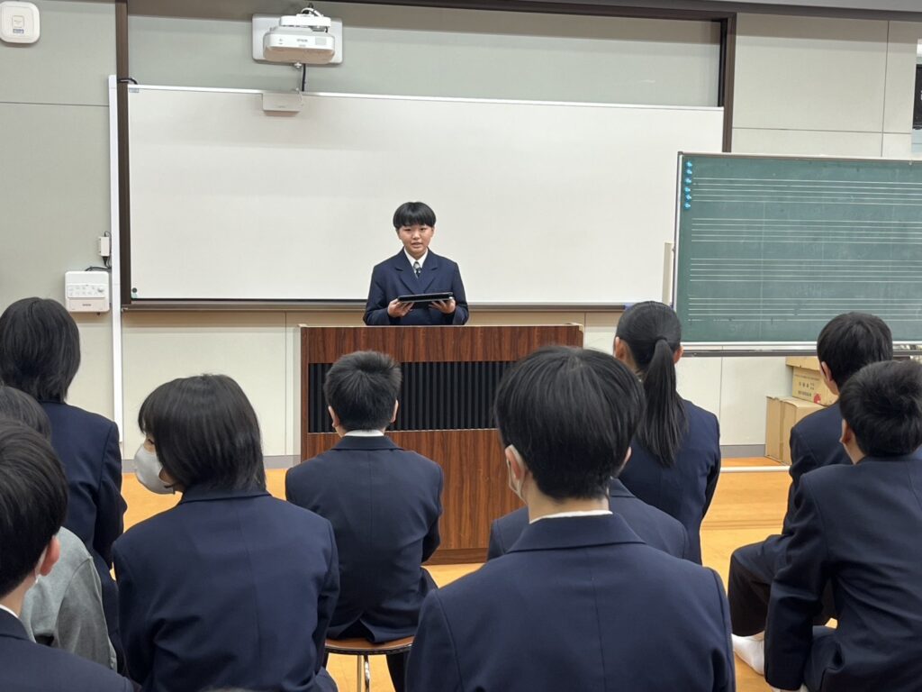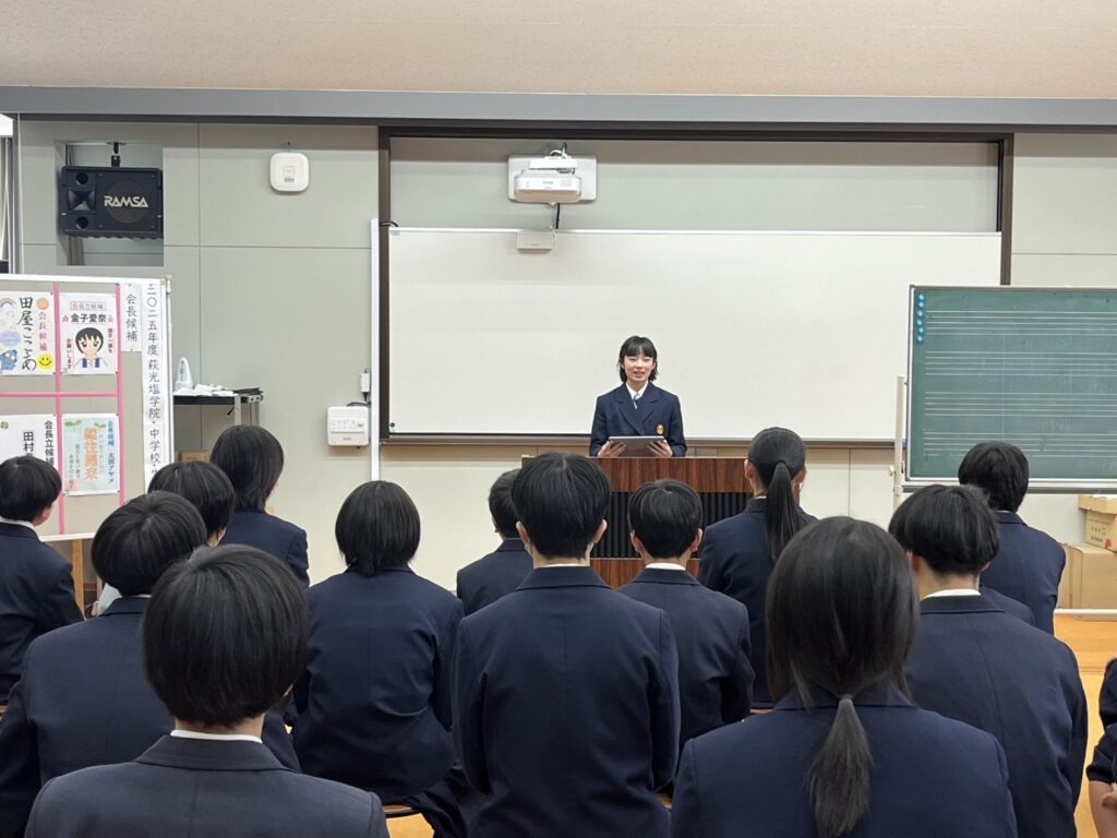 中学校生徒会選挙が行われました。中2から会長候補に、中1から副会長候補にそれぞれ4名が立候補し、学校をより良くするための公約を堂々と演説しました。