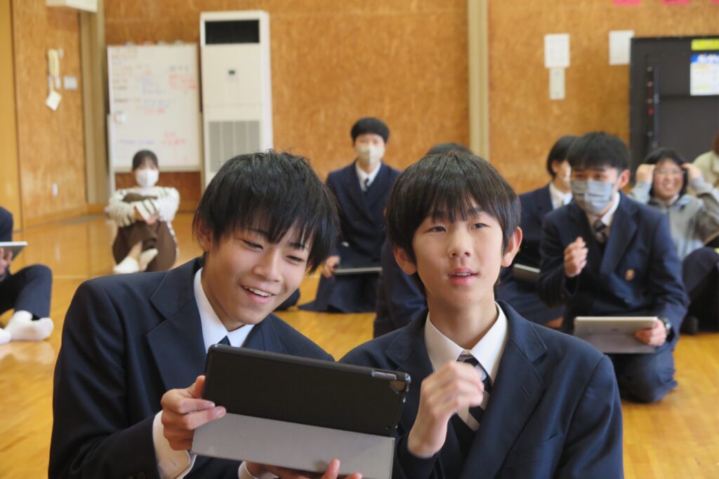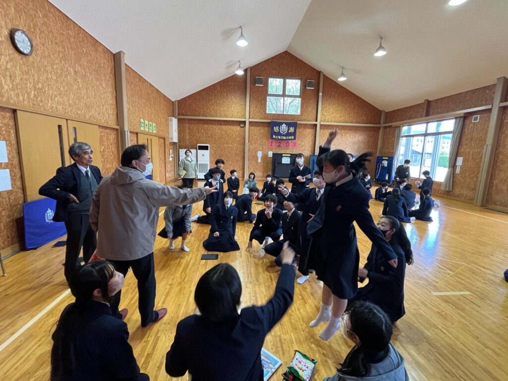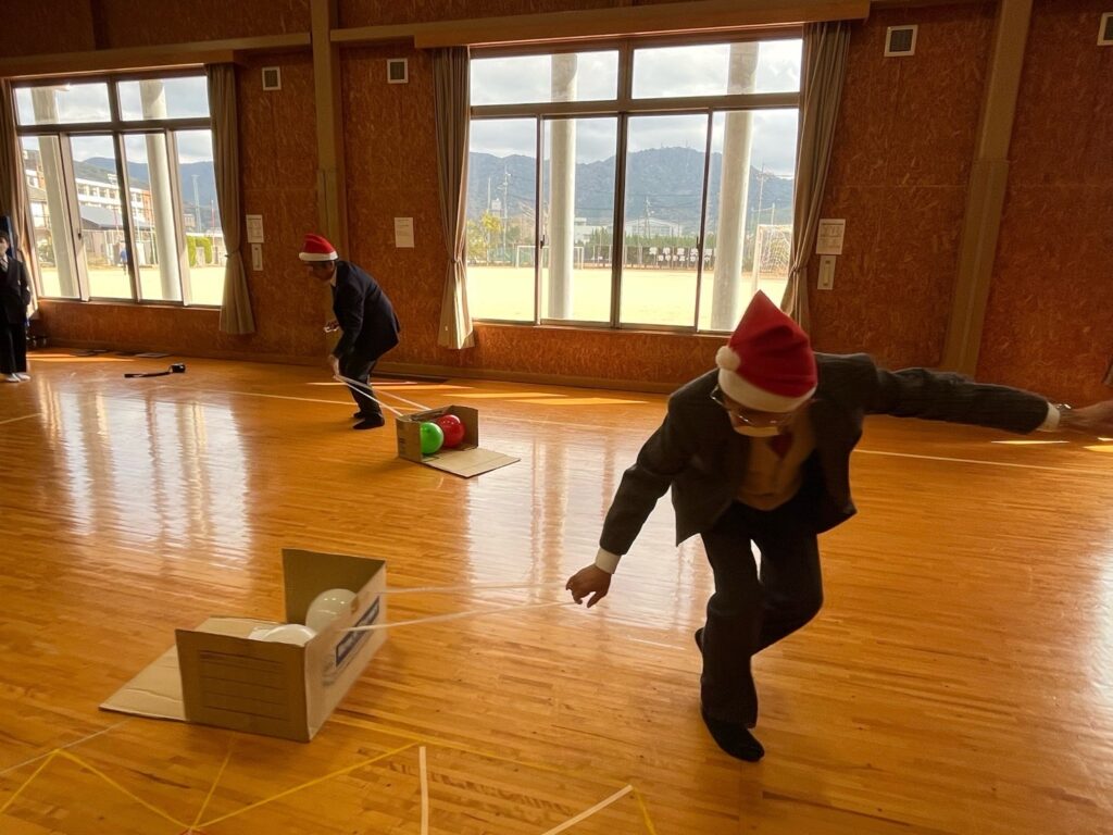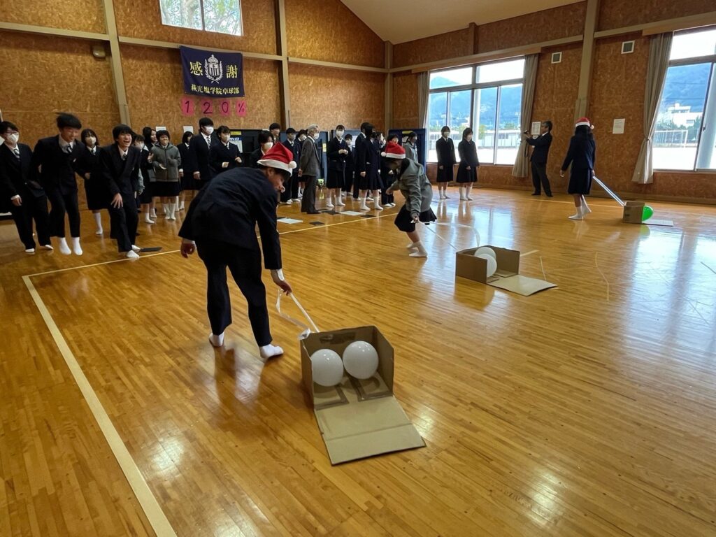 中学校クリスマス会が行われ、生徒会企画のなぞなぞ「三択ロース」、宗教委員企画の「ソリレー」、文化委員企画の「結晶わたりゲーム」と工夫を凝らしたゲームでみんなで盛り上がりました。