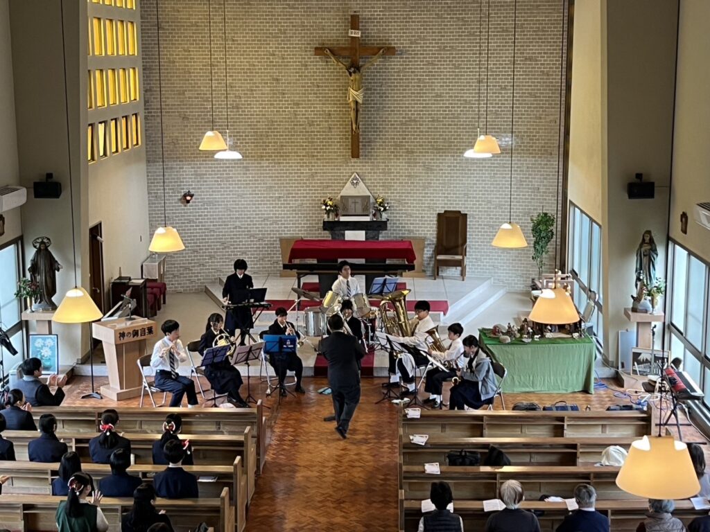カトリック萩教会で行われた「クリスマス聖堂コンサート」に吹奏楽部と中高のボランティア合唱団が参加しました♪