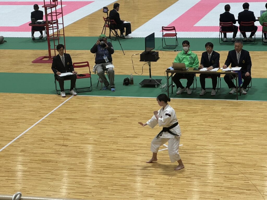 女子自由単独演武の部に出場し、日頃の修練の成果を存分に発揮しました。しかし、目標としていた点数にはあと一歩及ばず、惜しくも予選敗退という結果となりました。